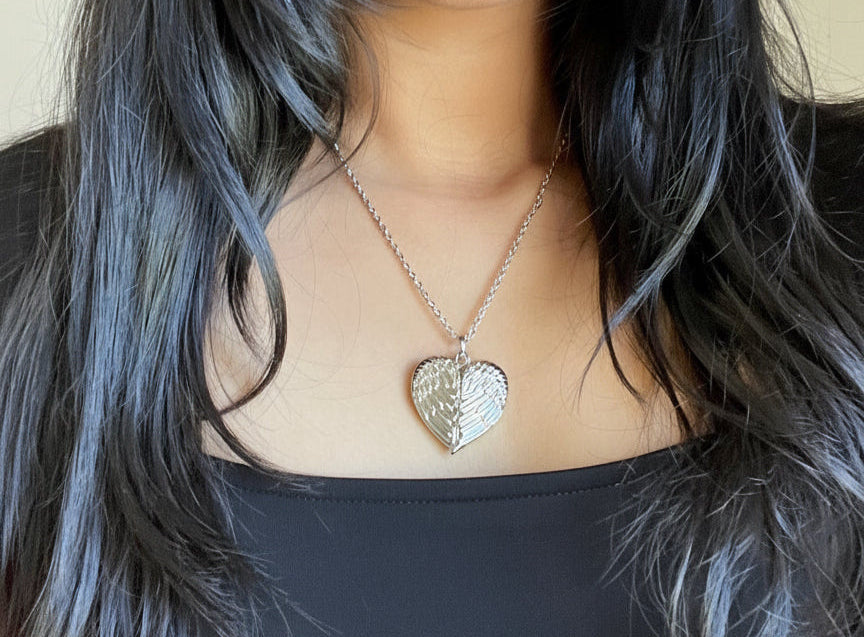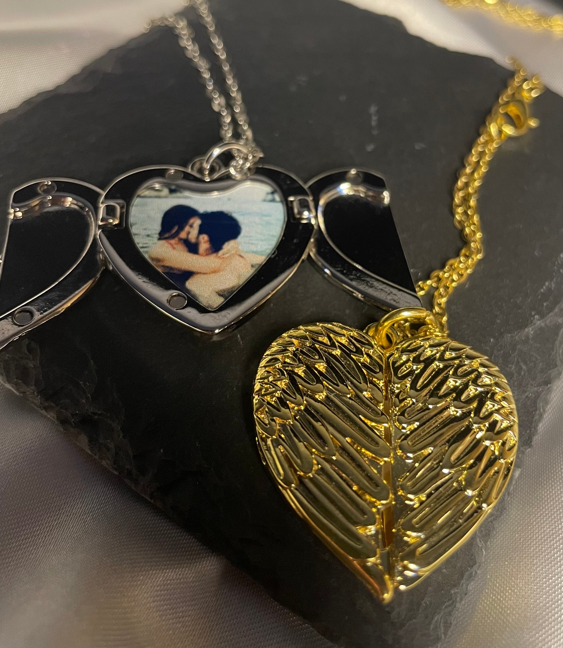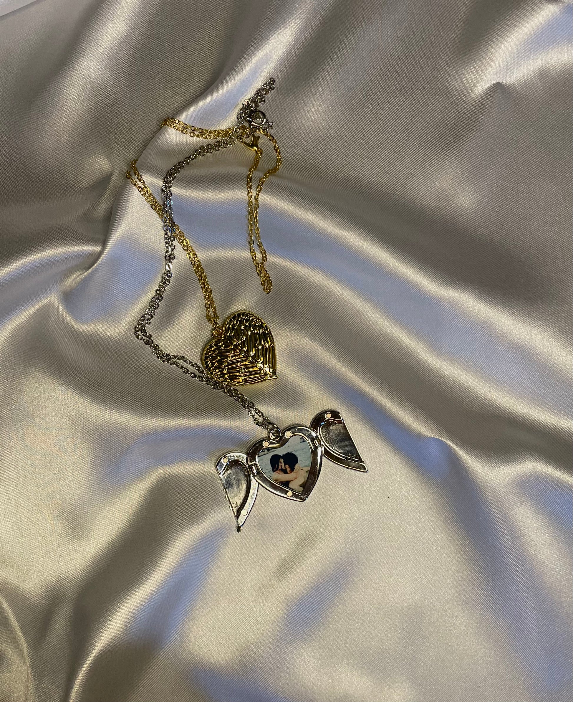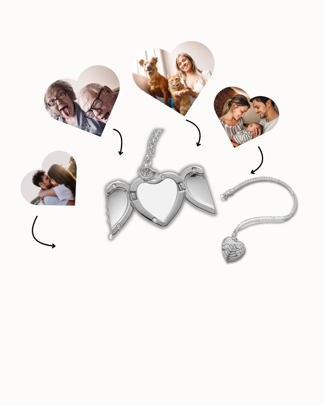 Custodia d’Amore è una collana raffinata a forma di cuore con ali apribili, pensata per custodire nel modo più intimo e speciale l’immagine di chi ami.